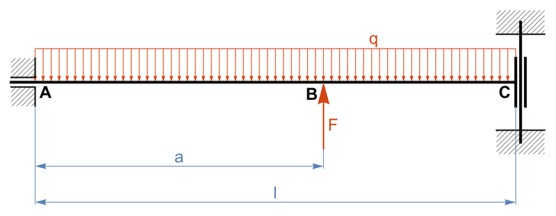 Známe délku nosníku l a velikost spojitého ztížení q. Určíme velikost síly F tak, aby průhyb nosníku na pravém konci (v bodě C) byl nulový.