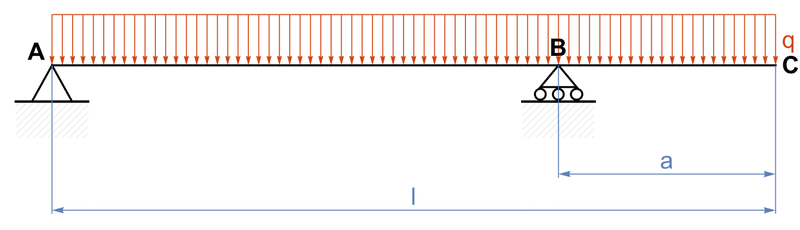 Nosník je podepřený v bodech A a B. Převislý konec má délku a - viz obrázek.